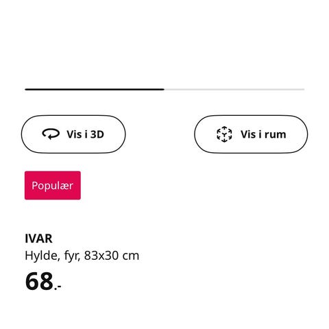 Jeg har 2 hylder til Billy (80x30cm) og 3 hylder til Ivar 60cm