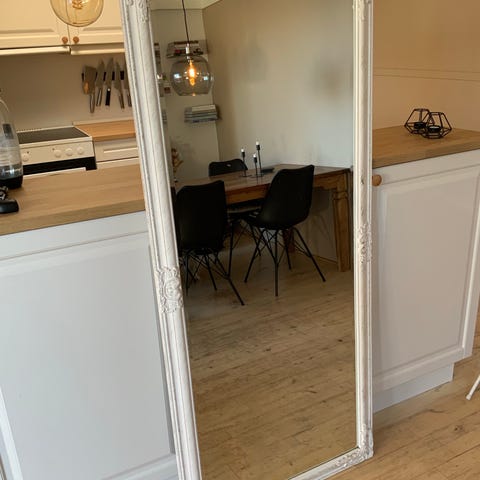 Spejl med hvid træramme. Spejlet har en rektangulær form med en enkel, dekorativ udskæring nederst. Det kan både stå på gulvet eller hænge på væggen.