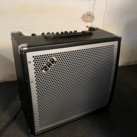 ZAP E-10 guitarforstærker med en effekt på 10 watt. Forstærkeren er sort og har kontrolknapper til volumen, gain, bass, mid og treble. Den har en indgang til guitar og en hovedtelefonudgang. Forstærkeren er kompakt og bærbar med et håndtag på toppen.