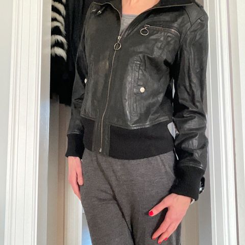 Læderjakke, str. 38, Vintage. Så lækker vintage læderjakke. Sort med de flotteste pastelfarver. Original fra 1980’erne. Punk stil i oversize look med flagermus ærmer. Passer en størrelse medium, men har en god pasform på trods af den er over size. Som taget ud fra Nina Hagens klædeskab! Købt i vintage butik i Berlin.
