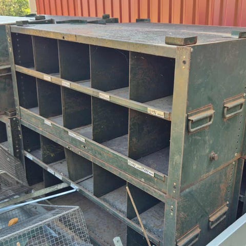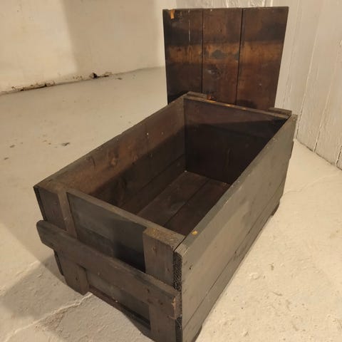 Militær opbevaringskasse lavet af træ og metal med grøn farve. Kassen har en aftagelig låg og metalhåndtag på siderne for nem transport. Egnet til opbevaring af forskellige genstande og kan anvendes både indendørs og udendørs. Str 55x50x42