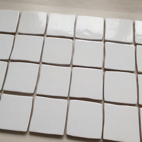 Fliserne er delvist afrensede for flisemørtel på bagsiden.