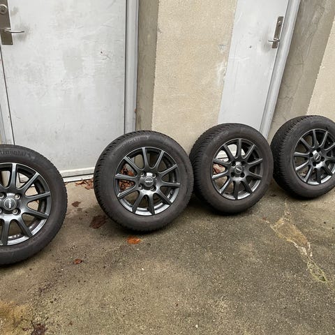 Continental WinterContact TS 850 dæk med fælge i størrelsen 185/60 R15. Dækkene er vinterdæk designet til at give greb og sikkerhed under kolde og glatte vejforhold.
