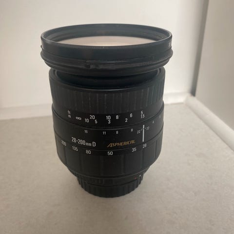 Et velfungerende objektiver, Sigma 28-80 mm - F: 3,5-5,6 II. Blitz Braun Vario Zoom 340 SCA og 3 beskyttelsesglas (gul, rød og polaroid). Defekt kamera Nikon F50 medfølger.