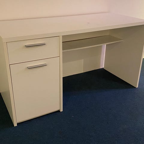 Fint skrivebord fra Jysk i beton/hvid melamin med hylde, skuffe og skab. Nypris 1099.