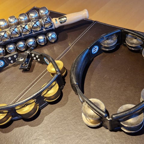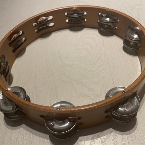 To tamburiner lavet af træ med metalbjælder