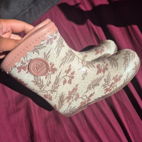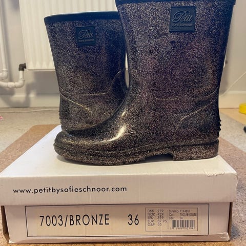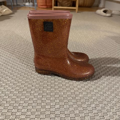 Petit by Sofie Schnoor Børnegummistøvler i størrelse 28, designet til både drenge og piger. Støvlerne er lavet af gummimateriale med en glitrende overflade, egnet til vådt vejr og udendørs brug.