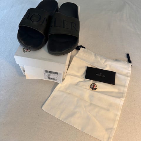 Moncler Mon Slide sandaler i størrelse 39 til damer. Sandalerne er sorte og lavet af polyurethan, både i overdel og for, med en sål af 100% gummi. Modellen har et enkelt design med Moncler-logo på overdelen. Sandalerne leveres med en Moncler opbevaringspose.