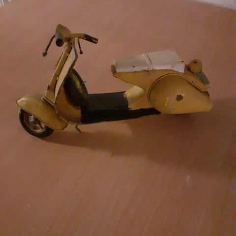 Vespa 125 U 1953 model scooter miniature in beige color. Detailed scale model featuring classic design elements from the 1953 Vespa 125 U. Suitable for collectors and display purposes. Vespa 125 U fra 1953 på podie. Længde på podie 10,4 * 5,4 cm. Pris 200 kr.