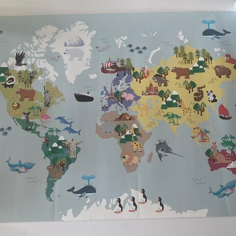 Illustreret verdenskort i pastelfarver med dyr på kontinenterne. Denne søde plakat med livlige farver er perfekt til et børneværelse. Verdenskort er fantastiske til børn, der gerne vil lære, hvor forskellige dyr såsom løver, hajer og krokodiller lever.