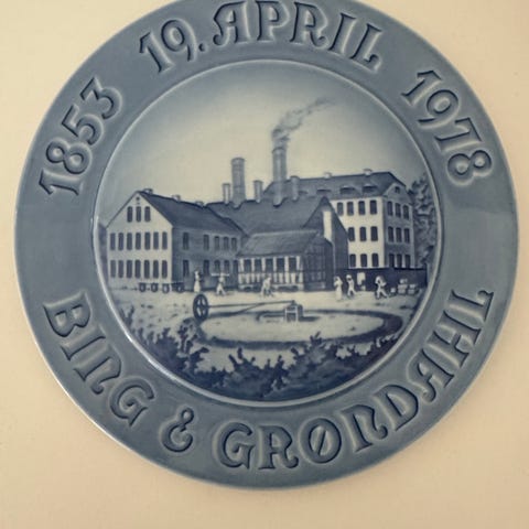 Fin lille hvid platte fra Bing & Grøndahl med guldtryk, som viser en bonde, som sår sine marker.