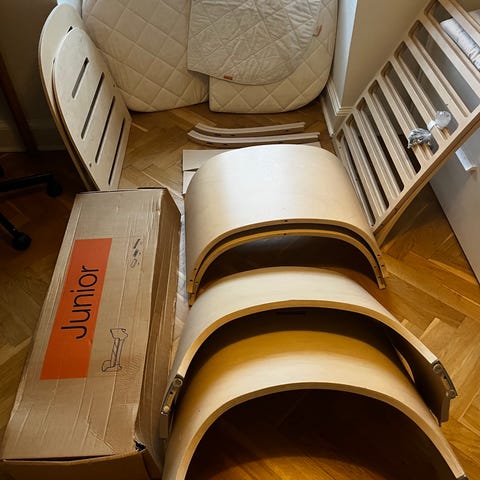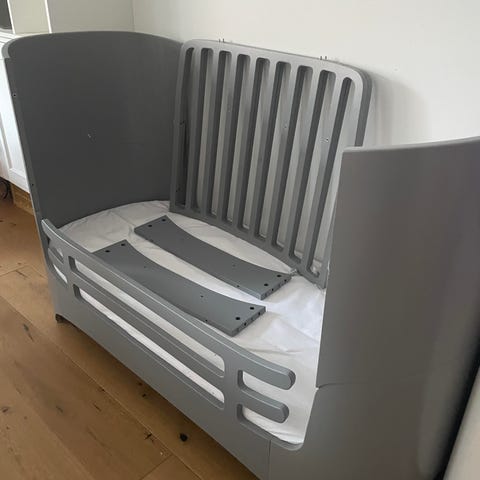 Alt udstyr til tremmeseng med løftet bund og høje gavle. Bunden kan flyttes ned, når dit barn begynder at kunne rejse sig. Når der ikke længere er brug for tremmerne, kan du fjerne dem sammen med de høje gavle. Herefter kan du hurtigt og nemt omdanne tremmesengen til en juniorseng.