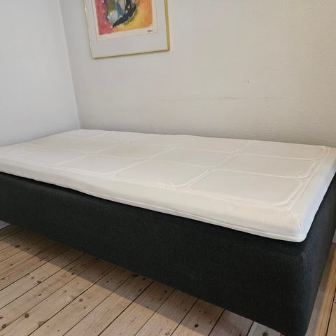 Flot og kvalitet boxmadras med topmadras. Den har stået i gæsteværelset i ca 1.5-2 år og brugt samlet set ca 15 gange.