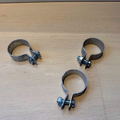 2 stk. galvaniseret bøjler til vægmontering, H 150, B 54, D 30, 2 stk. mørkegrønne, H 73, B 32, D 16 cm., samlet pris.