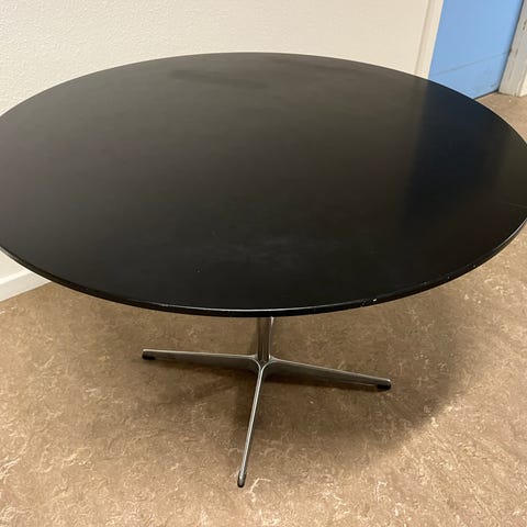 Fritz Hansen Arne Jacobsen spisebord med rundt bordplade i palisander finer. Designet af Arne Jacobsen, bordet har et solidt stel og en glat overflade. Egnet til spisestue eller mødelokale, designet til at rumme flere personer komfortabelt. Bord med 6-grenet søjlefod. Bordpladen trænger til en let slibning derfor prisen.