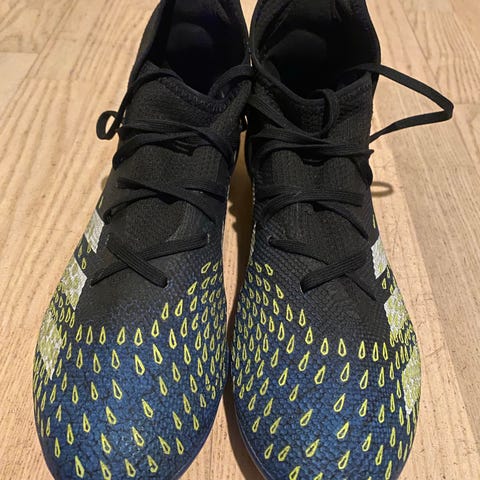 Adidas Predator FREAK.3 TF fodboldstøvler i blå og sort farve. Støvlerne har en størrelse 42 2/3 og er designet til brug på kunstgræsbaner (TF - turf). Materialet er syntetisk, og støvlerne har snørebånd og en ankelhøj sokkekonstruktion for støtte.