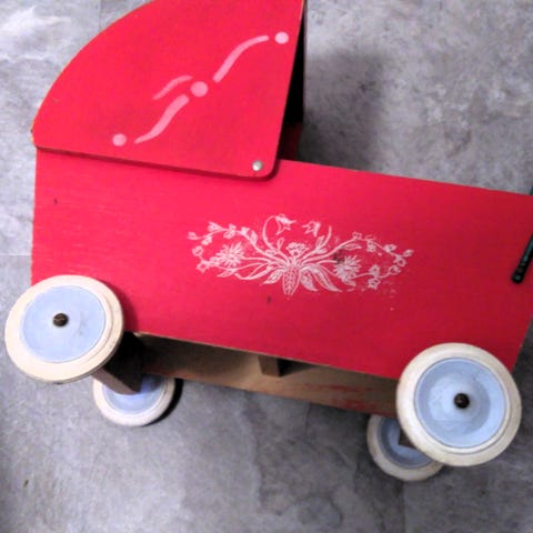 Den er lavet af træ, med gummi håndtag og er i fin stand