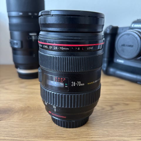Velholdt Canon 24-70’er 1/2.8. Fungerer upåklageligt. Modlysblænde medfølger.