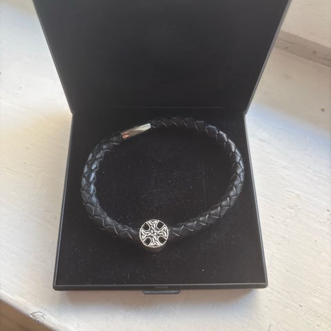 Lækkert armbånd i sort læder. Er blevet brugt, så læderet har givet sig og fået patina (det gør