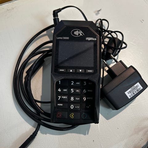 Verifone VX 520 Betalingskortterminal med farveskærm og tastatur. Enheden er designet til håndtering af betalingstransaktioner og er fremstillet i robust materiale. Produktet er sort og har kompakt størrelse, egnet til kommerciel brug.