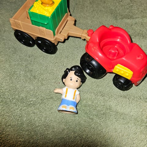 Fisher-Price Little People traktor legetøj med anhænger. Fremstillet i plastik med farverne grøn, gul og rød. Indeholder en traktor og to figurer, egnet til børn.