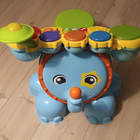 Fisher-Price legetøjs trommer designet til børn. Fremstillet i blå og grøn plastmateriale. Indeholder elektroniske knapper og lydelementer til interaktiv leg. Velegnet til små børn til udvikling af motoriske færdigheder og rytmeforståelse.