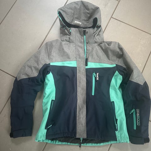 Skijakke, brugt men fin stand. Enkelte steder ved lommer og lynlås er der lidt skjolder/mørkere områder - var vanskeligt at få med på foto, men se de sidste.