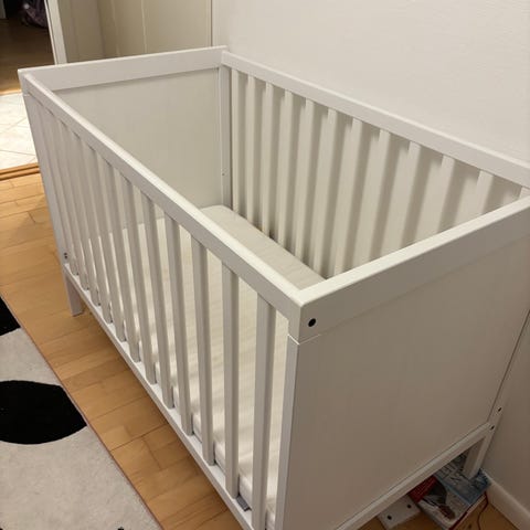 Siden kan tages af når barnet selv skal kunne komme ind og ud af sengen. Så kan man sætte en sengehest på.