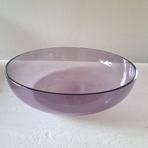 Holmegaard Fionia glasfad lavet af transparent glas med en dekorativ, bølget kant og tekstureret overflade. Fadet har en rund form med en diameter på cirka 30 cm. Velegnet til servering eller som dekorativt element.
