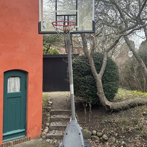 Kvalitets udendørs basketballstativ med fast højde. Stativet er lavet af metal og composit i en robust konstruktion til udendørs brug. Kvalitetsstativ oprindeligt solgt hos Tress. Plade kan stadig købes som reservedel (se fx her: https://www.tress.com/dk/basketballplade-112-x-73-cm-652802-1). Oprindelig nypris for samlet sælt: 5.000,- Bemærk at der er tale om et stort basketball stativ, der kræver trailer for afhentning.