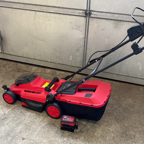 Sælger denne næsten nye batteridrevet plæneklipper.