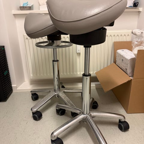 KLINIK/KONTOR, SADELSTOL, MÆRK. SIBEL, 5 HJUL, INDSTILLING FOR HØJDE MED PUMPESTANG. POLSTRET SÆDE I SORT KUNSTLÆDER. SE FOTO FOR SADEL OG HJUL.