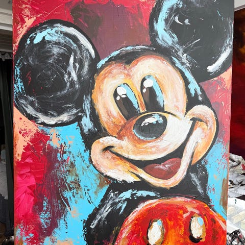 5 maleriermed motiver af Donald Duck, Minnie Mouse og Tintin. Plakaterne er i farverig tegneseriestil og varierer i størrelse. Materiale og præcis størrelse er ikke angivet. Velegnet til dekoration med klassiske tegneseriefigurer.