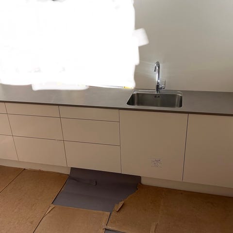 28 mm Grånistret laminat fra Invita/HTH med skarp forkant inkl. underlimet vask. Ca. 112 cm lang hvis den del hvor det ikke er laminat skæres af - vasken vil i så fald sidde i højre side af bordpladen (set forfra).