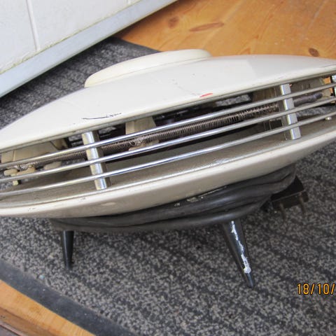 Elvarmeovn med hvit farge og kompakt design. Utstyrt med to justerbare knotter for temperatur- og effektkontroll, samt en rød indikatorlampe. Passer til oppvarming av mindre rom eller områder.