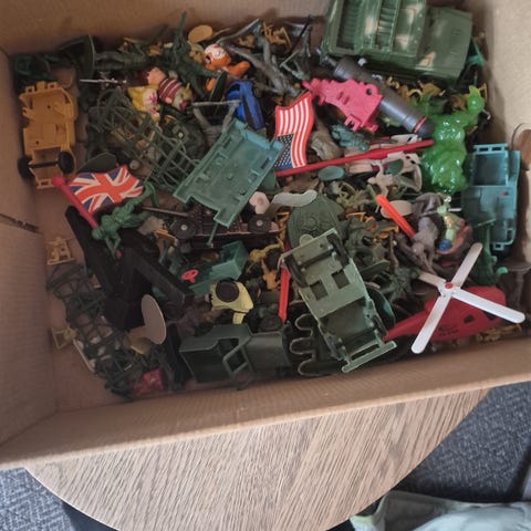 Militærlegetøj sæt bestående af en grøn kampfly med blå cockpit, to kampvogne i grøn og beige farve, samt flere soldaterfigurer. Legetøjet er fremstillet i plast og metal og er designet til leg og samling. Sættet indeholder detaljerede våben og militærudstyr, egnet til børn med interesse i militærtema.