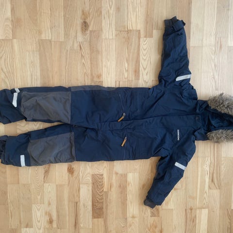 Didriksons flyverdragt til dreng eller pige i størrelse 120. Dragten har hætte og er mørkeblå med mørkegrå detaljer. Materialet er velegnet til udendørs brug og sikrer komfort og bevægelsesfrihed.
