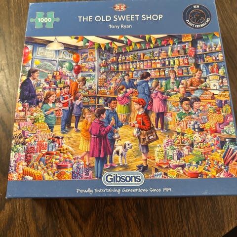Gibsons Surprises in Store puslespil med juletema, der viser en butiksscene med juletræer og mennesker. Puslespillet har detaljerede illustrationer og er velegnet til samling i juletiden.