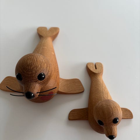 Denne søde hunsæl er designet af Chresten Sommer og er lavet i smukt egetræ. Sælen er designet således at hovedet kan drejes lige derhen hvor du vil, så den kan få nøjagtigt det udtryk du ønsker.