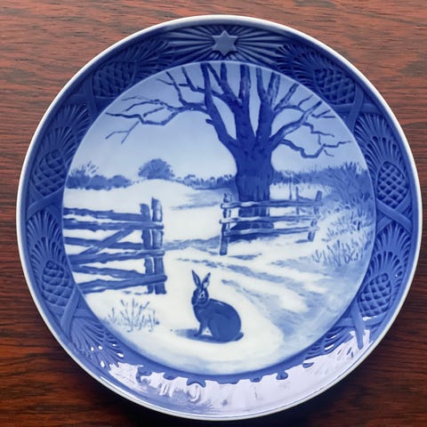 Royal Copenhagen Kai Lange Juleplatte 1968 porcelæn, blå og hvid farvet. Juleplaten viser et vinterscene. 1. Sortering