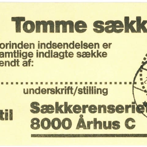 Sjældent manilamærke, brugt ved indsendelse af defekte/snavsede postsække til Sækkerenseriet i Århus C. Forsynet med pænt brotypestempel Sydals 21.6.1991. Passer fint i en posthistorisk samling.