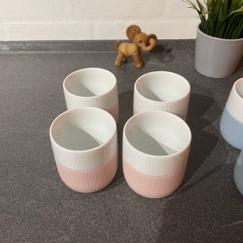 10 stk. Royal Copenhagen Riflet krus i forskellige farver. Krusene er lavet af porcelæn og har et riflet mønster med hvid øverste kant.