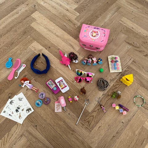 En enhjørningtaske og et sugerør og en hoppebolde en notesbog og en bamse og nogle tegne kridt og sæbebobler og en badebold