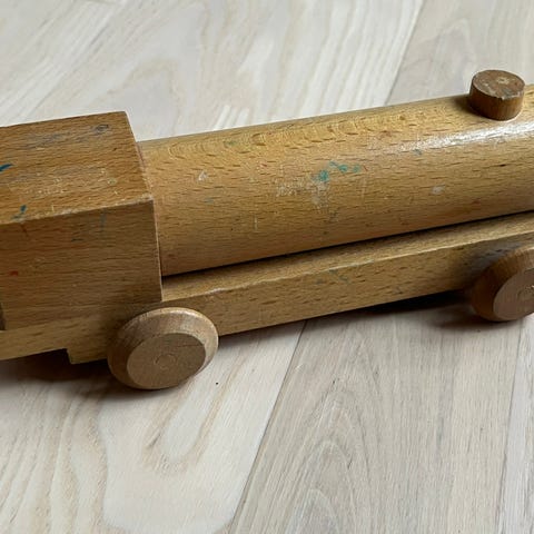 Gammelt Kay Bojesen trælegetøj. Færgen (mangler master), Lokomotiv (mangler hjul) og to vogne, samt to skinner. Færge og lokomotiv er stemplet. Sælges samlet.