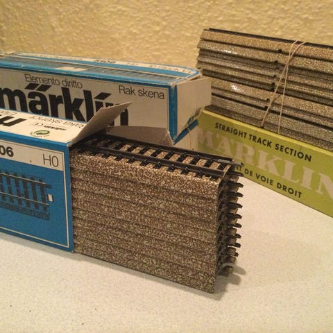 Sælger et flot og komplet parti af Märklin 5106 lige skinner (M-skinner) – i alt 6 æsker med 10 skinner i hver (60 stk. i alt).