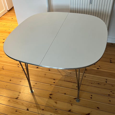 Har været brunt, er malet hvidt. Med to runde tillægsplader der hver måler 43 cm.