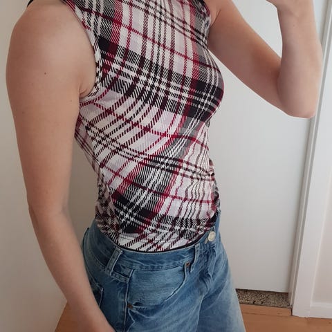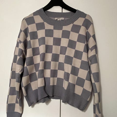Ternet sweater og bukser, sæt, i beige. Dette sæt er i størrelse M og har et klassisk ternet mønster. Perfekt til afslappet brug eller som et stilfuldt hverdagsoutfit.