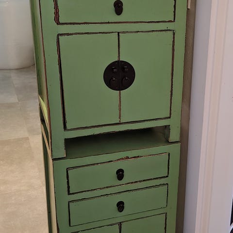 Skønt tansu chest i to dele, kan bruges samlet eller hver for sig. De to dele sidder sammen med medfødte metal dutter der passer i et metalbeslag. Kan nemt løftes fra hinanden hvis det er det man ønsker.
