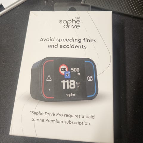 Saphe GPS Speedometer med sort design og elektronisk funktionalitet. Enheden viser hastighed og gennemsnitshastighed i km/t og har visuelle advarsler. Velegnet til brug som ekstra sikkerhedsudstyr i bil eller på motorcykel.