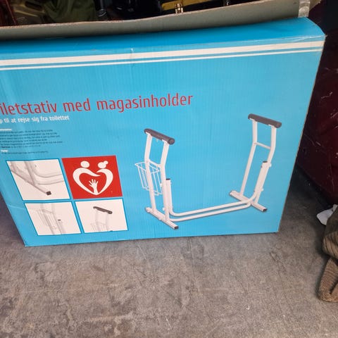 Stilrent, hvidt toilet-støttestativ lavet af metal med grå kunststof-armlæn og grå gummifødder. Designet til støtte og balance ved toiletgang, egnet til brug i hjemmet. Justerbar højde og bredde (7 trin). Konstrueret for nem håndtering, undgår boringer i væg og gulv, kan bruges ved alle former for toilet, også væghængte. Let at gøre rent. Belastbar med 120 kg. Vægt 4kg.
